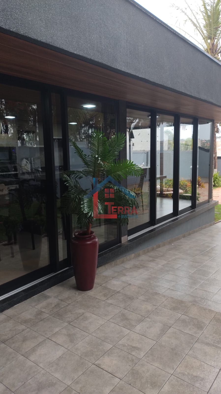 Sala de descanso fechada em blindex na área da piscina.